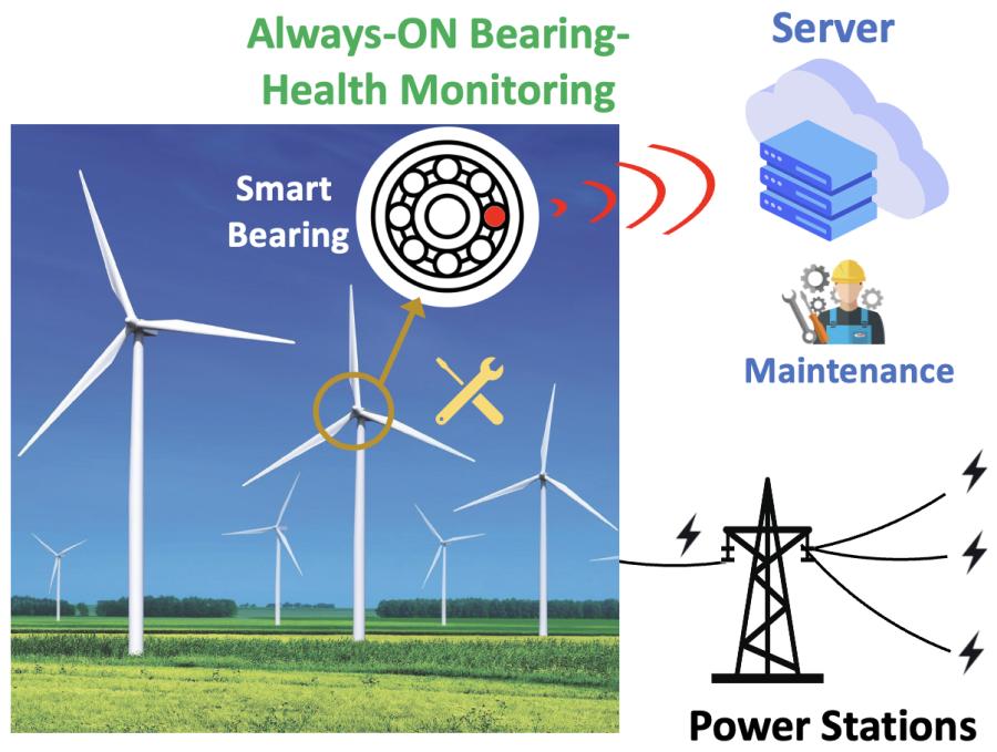 Reliability is crucial for wind turbines. To support heavy rotating blades, main shaft bearings continuously take force up-to, equivalently, 100’s of tons. For reliable operations, in-bearing smart sensors are implemented to collect reliability-related data. Currently, these sensors are powered by batteries, which typically last for a few months. After then, they need to be replaced to maintain sensor operation. However, battery replacement means disassembling turbine blades to reach main-shaft bearings, which costs significant time, manpower, and money. This project will develop a reliable, cost-effective, and sustainable power solution using energy harvesting technology, which realizes fully-autonomous in-bearing sensors.